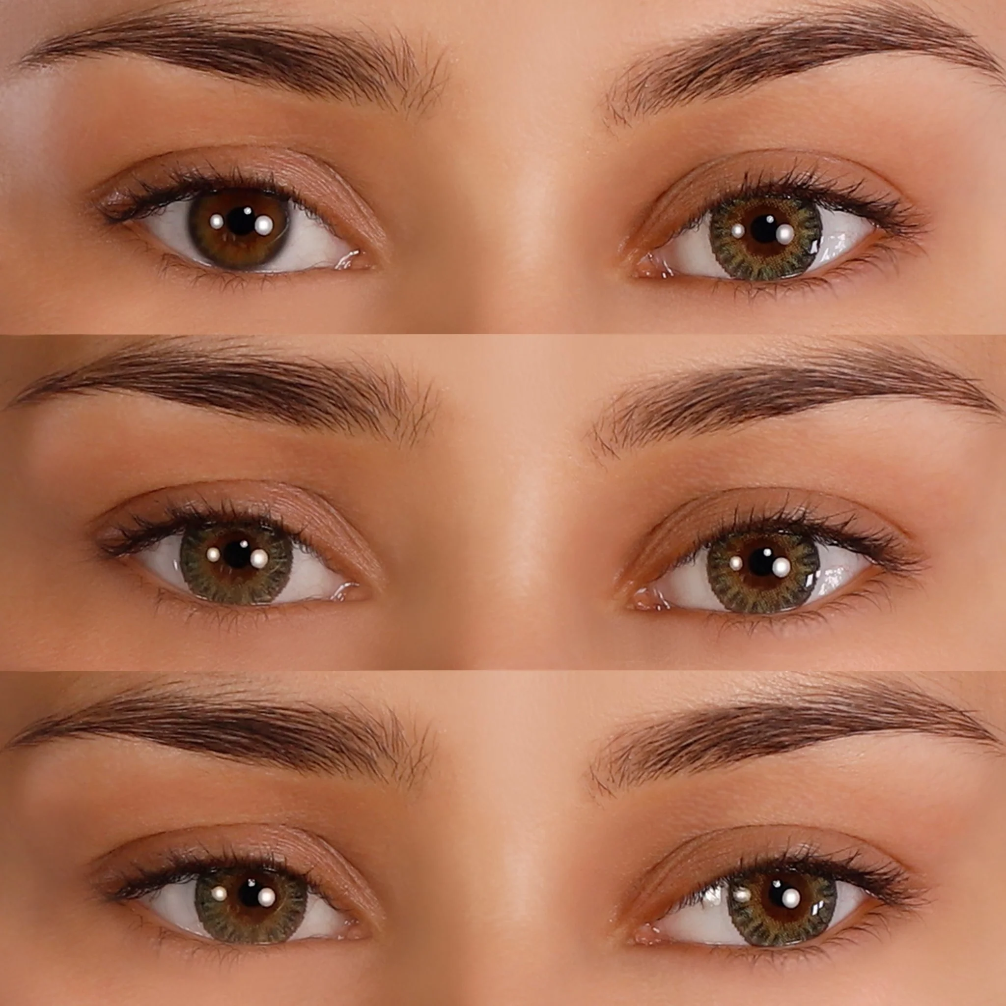 On light natural eyes, these beauty lenses give an almost sunny effect, with a golden green iris and contrasting textured outer ring.