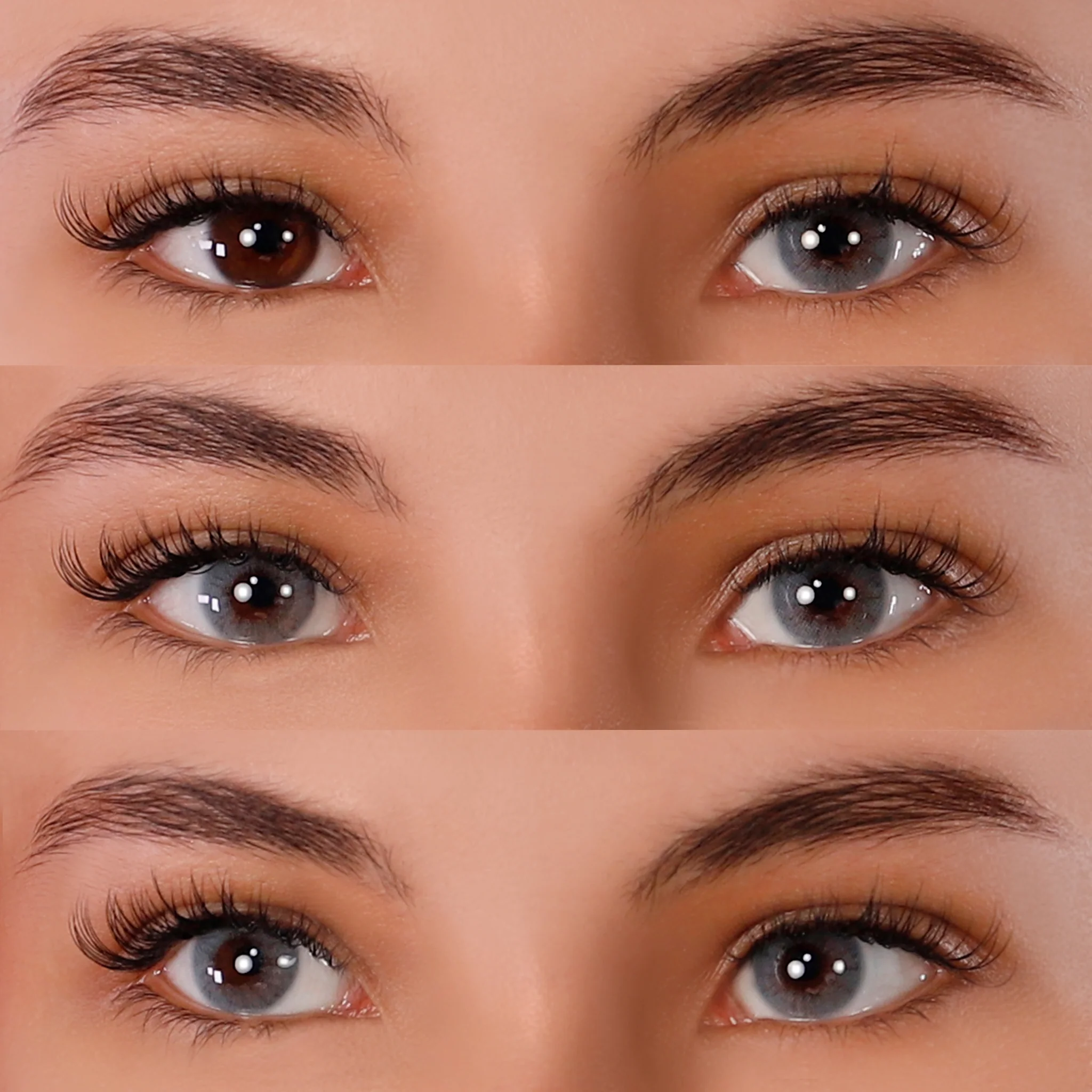 On light natural eyes, these coloured contact lenses show off their soft side, in subtle blue-grey shades.